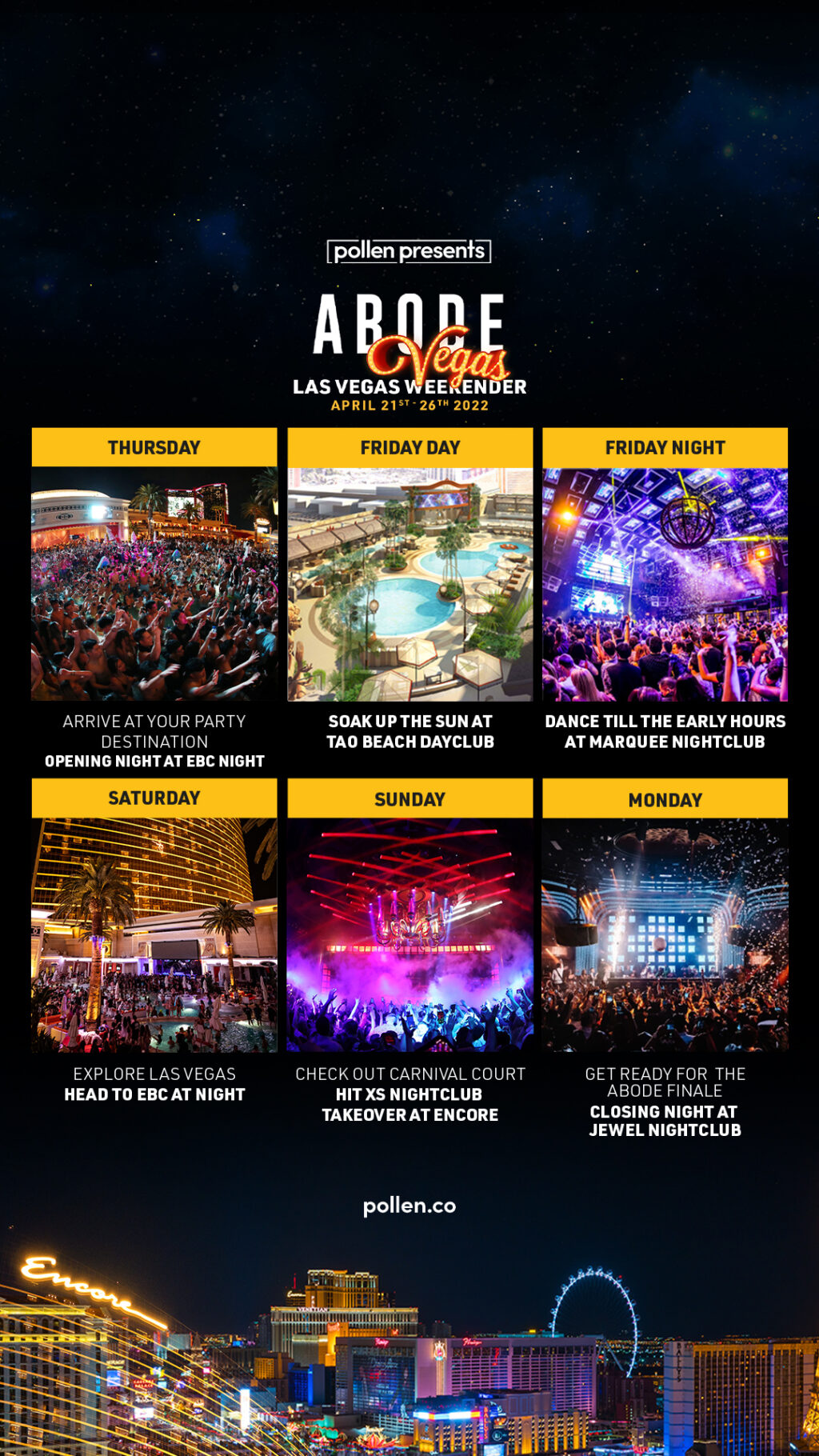 Organized by Pollen, Abode Las Vegas is a multi-venue festival featuring some of the biggest names in house and techno music. Packages include entry to all pool parties and nightclub events plus lodging.