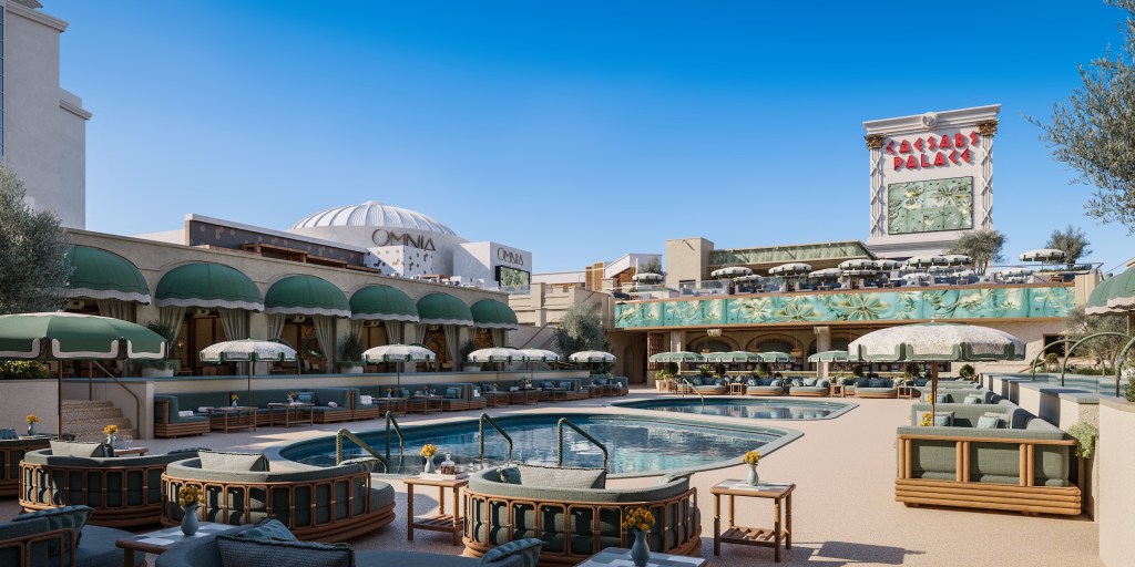 The 46,000-square-foot venue will be built as a separate structure in front of Caesars Palace, connected to the existing Omnia Nightclub with a pedestrian bridge. Omnia Dayclub will feature two main pools, two plunge pools, cabanas, booths, chairs, and a DJ platform.